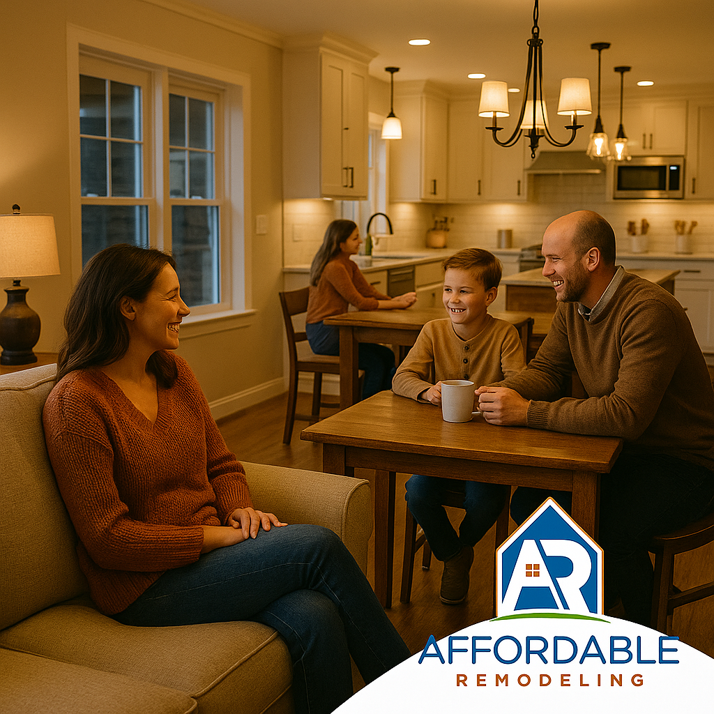 This image portrays a warm, inviting family moment inside a beautifully remodeled open-concept home. Soft golden lighting fills the space, highlighting rich wooden tones and a cozy atmosphere. A mother sits comfortably on a beige armchair, smiling warmly toward her husband and son, who share a laugh over mugs of coffee at a wooden dining table. In the background, their daughter sits at the kitchen island, adding to the sense of connection and togetherness. The freshly updated kitchen features white cabinetry, modern lighting fixtures, and a tiled backsplash — creating a perfect blend of comfort and modern craftsmanship. The Affordable Home Remodeling logo appears in the corner, tying the image to the company’s brand of warmth, family, and quality renovation work.